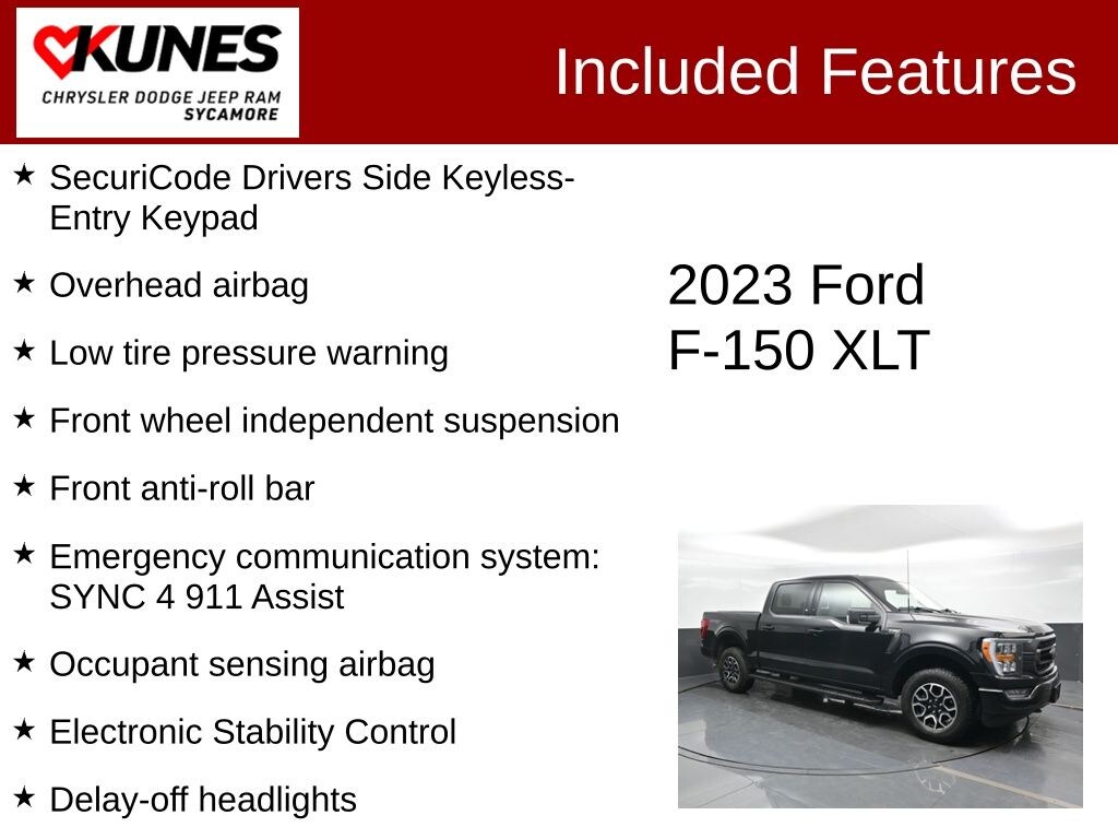 Recent Arrival! Certified. 2023 Ford F-150 XLT CARFAX One-Owner. Clean CARFAX. ** Back-up Camera, ** Remote Start, ** Trailer-Tow Hitch, 10-Way Power Driver & Passenger Seats, 2-Bar Style Grille w/Chrome 2 Minor Bars, 6" Extended Dark Gray Accent Running Board, 8" Productivity Screen in Instrument Cluster, Accent-Color Step Bars, Alloy wheels, Auto-Dimming Rear-View Mirror, Black 2-Bar Style Grille w/Black Surround/Accents, Body-Color Door & Tailgate Handles, Body-Color Front & Rear Bumpers, Box Side Decals, Bright Polished Step Bars, Bumpers: chrome, Chrome Door & Tailgate Handles w/Body-Color Bezel, Chrome Single-Tip Exhaust, Cloth 40/20/40 Front Seat, Compass, Delay-off headlights, Driver door bin, Driver vanity mirror, Electronic Stability Control, Emergency communication system: SYNC 4 911 Assist, Front anti-roll bar, Front Center Armrest w/Storage, Front fog lights, Front reading lights, Front wheel independent suspension, Heated door mirrors, Heated Front Seats, Illuminated entry, Low tire pressure warning, Occupant sensing airbag, Onboard 400W Outlet, Outside temperature display, Overhead airbag, Overhead console, Panic alarm, Passenger door bin, Passenger vanity mirror, Rear reading lights, Rear step bumper, Rear Under-Seat Storage, Rear window defroster, SecuriCode Drivers Side Keyless-Entry Keypad, Speed control, Speed-sensing steering, Split folding rear seat, Steering wheel mounted audio controls, Tachometer, Telescoping steering wheel, Tilt steering wheel, Trip computer, Variably intermittent wipers, Voltmeter, Wheels: 17" Silver Painted Aluminum, Wheels: 18" 6-Spoke Machined Aluminum, Wheels: 18" Chrome-Like PVD, Wrapped Steering Wheel, Zone Lighting.