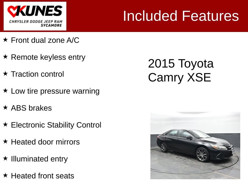 Recent Arrival! 2015 Toyota Camry XSE Clean CARFAX. ABS brakes, Alloy wheels, Electronic Stability Control, Front dual zone A/C, Heated door mirrors, Heated front seats, Illuminated entry, Low tire pressure warning, Remote keyless entry, Traction control.