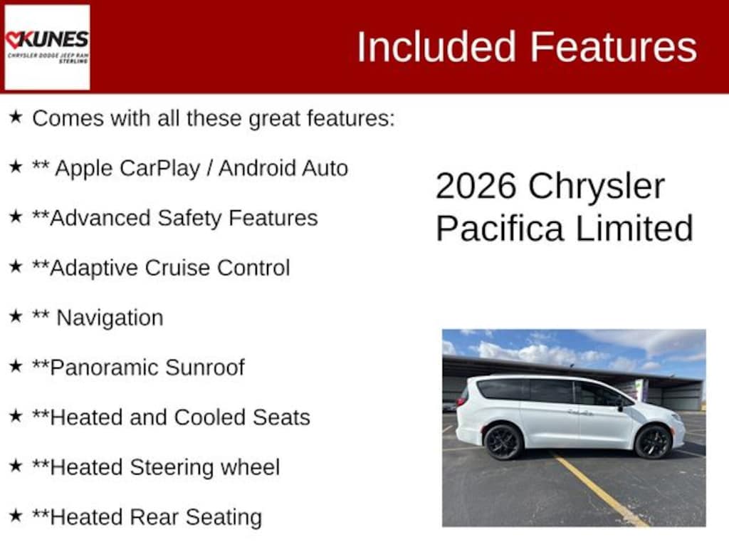 The 2026 Pacifica can carry all the passengers and cargo you need in style and comfort. Also included with every new vehicle: LIFETIME "NO FEAR" WARRANTY, FIRST OIL CHANGE, and AT HOME COURTESY DELIVERY! Call us for full details! We pride ourselves on honesty and integrity, but please note that mistakes or misprints due to human error are possible. Find out why our dealerships have won DealerRater.com DEALER OF THE YEAR a whopping 10 TIMES! Call, email, or live chat with one of our friendly sales professionals now to schedule your test drive! Prices shown do not include taxes, license, and title fees and a $367.70 documentary service fee. Price includes: $2250 - 2026 National Retail Bonus Cash . Exp. 11/03/2025