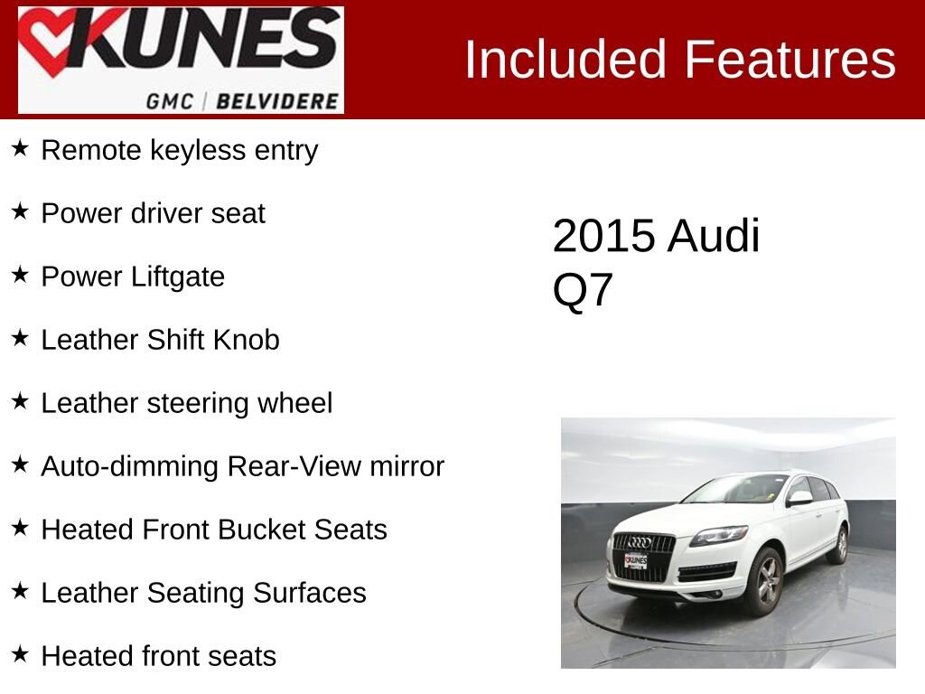 Recent Arrival! 2015 Audi Q7 3.0T Premium quattro 3.0T Premium quattro Auto-dimming Rear-View mirror, Heated Front Bucket Seats, Heated front seats, Leather Seating Surfaces, Leather Shift Knob, Leather steering wheel, Power driver seat, Power Liftgate, Power passenger seat, Remote keyless entry. White