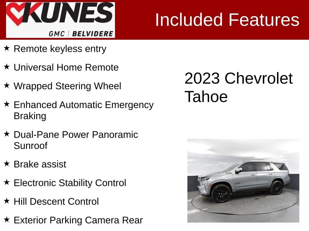 Certified. 2023 Chevrolet Tahoe High Country High Country 15 Diagonal Multi-Color Head-Up Display, 1st & 2nd Row Color-Keyed Carpeted Floor Mats, 2-Speed Active Electronic AutoTrac Transfer Case, 3rd Row 60/40 Power-Folding Split-Bench Seat, Apple CarPlay/Android Auto, Bose 10-Speaker Centerpoint Surround Audio Sys Ft, Brake assist, Bright Front & Rear Door Sill Plates, Chrome Door Handles w/Body-Color Strip, Color-Keyed Carpeting Floor Covering, Driver & Front Outboard Passenger Airbags, Dual Exhaust System, Dual-Pane Power Panoramic Sunroof, Electronic Stability Control, Enhanced Automatic Emergency Braking, Enhanced Driver Information Center, Exterior Parking Camera Rear, Floor Console, Hands-Free Rear Power Programmable Liftgate, HD Surround Vision, Heated 2nd Row Outboard Seats, Heated Steering Wheel, Hill Descent Control, Infotainment Display, Inside Rearview Auto-Dimming Rear Camera Mirror, Lane Change Alert w/Side Blind Zone Alert, LED Daytime Running Lamps, Memory Settings, Navigation System, Outside Heated Power-Adjustable Mirrors, Power Release 2nd Row Bucket Seats, Power Tilt & Telescopic Steering Column, Power-Retractable Assist Steps, Preferred Equipment Group 3LZ, Premium Package 2, Rear Camera Mirror Washer, Rear Cross Traffic Alert, Rear Pedestrian Alert, Remote keyless entry, Remote Start, Safety Alert Seat, SiriusXM Radio w/360L, Universal Home Remote, Wireless Charging, Wrapped Steering Wheel. Sterling Gray Metallic