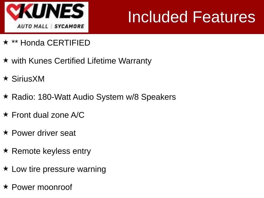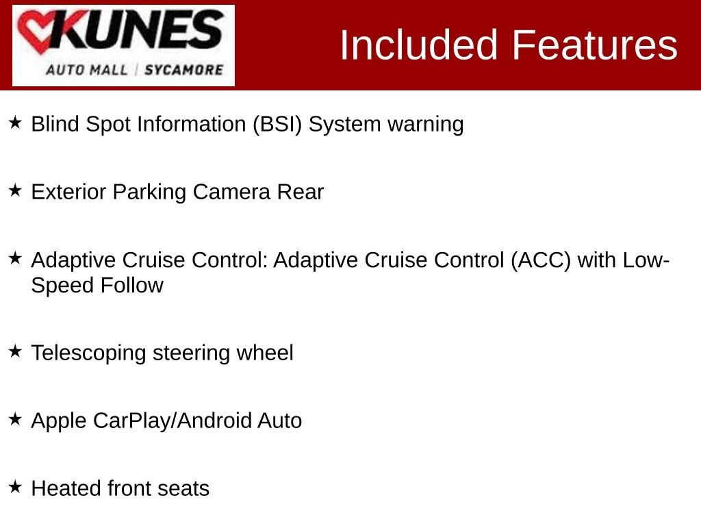 KUNES AUTO MALL OF SYCAMORE - Kunes Auto Group is dedicated to building peopleâs lives in the communities we serve. Weâre family-owned and operated. Gregg Kunes started with Kunes Ford Lincoln in Delavan, Wisconsin in 1996, and over the years we have grown to 40 automobile and RV dealerships throughout the Midwest. Our mission is to not only deliver exceptional customer service, but to serve our communities well in the form of projects, promotions, support, donations, and whatever else is needed. Find out why our dealerships have won DealerRater.com DEALER OF THE YEAR a whopping 10 TIMES! Call, email, or live chat with one of our friendly sales professionals now to schedule your test drive! Price excludes taxes, license and title fees and a documentary service fee. While we make every effort to ensure the data listed here is correct, there may be instances where some of the options or vehicle features may be listed incorrectly as we get data from multiple data sources. PLEASE MAKE SURE to confirm the details of this vehicle with the dealer to ensure its accuracy. Dealer cannot be held liable for data that is listed incorrectly. Prices shown do not include taxes, license, and title fees and a $367.70 documentary service fee.