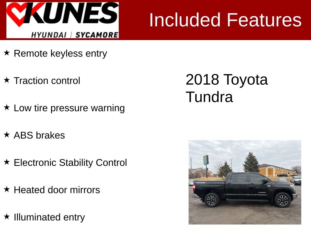 2018 Toyota Tundra SR5 4WD ABS brakes, Electronic Stability Control, Heated door mirrors, Illuminated entry, Low tire pressure warning, Remote keyless entry, Traction control.